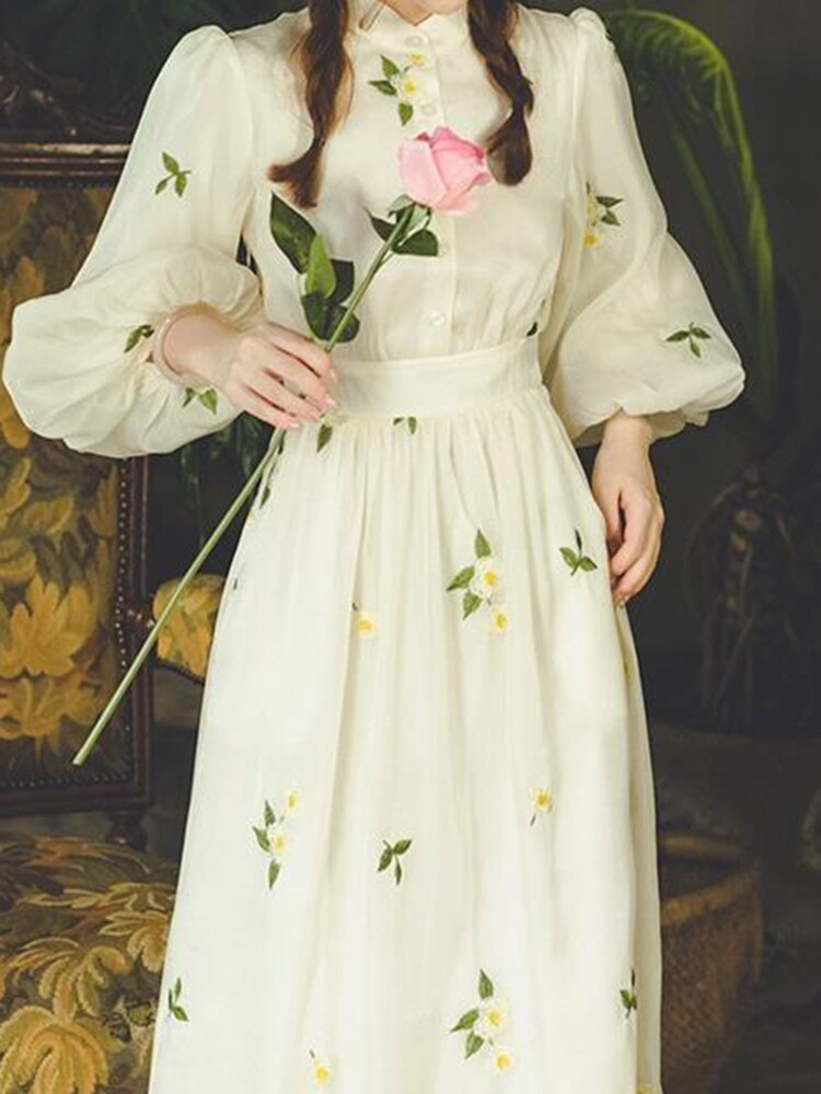 Elegant Print Dresses For Women Stand Collar Lantern Sleeve Single Breasted High Waist Vintage Hit Color Dress